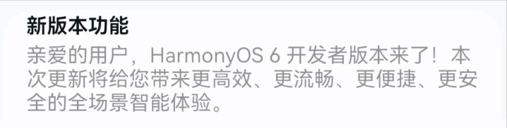 官方在更新日志中用了这样一句话:“亲爱的用户,鸿蒙OS 6开发者版本本次将带来高效流畅、更加便捷、健康的全场景智能体验。”