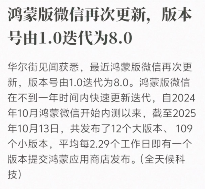关于后者,有两组数据可以参考:自鸿蒙微信上线以来,应用迭代速度非常快——据记录从 2024 年 10 月上线起已完成 12 个大版本和 109 个小版本;